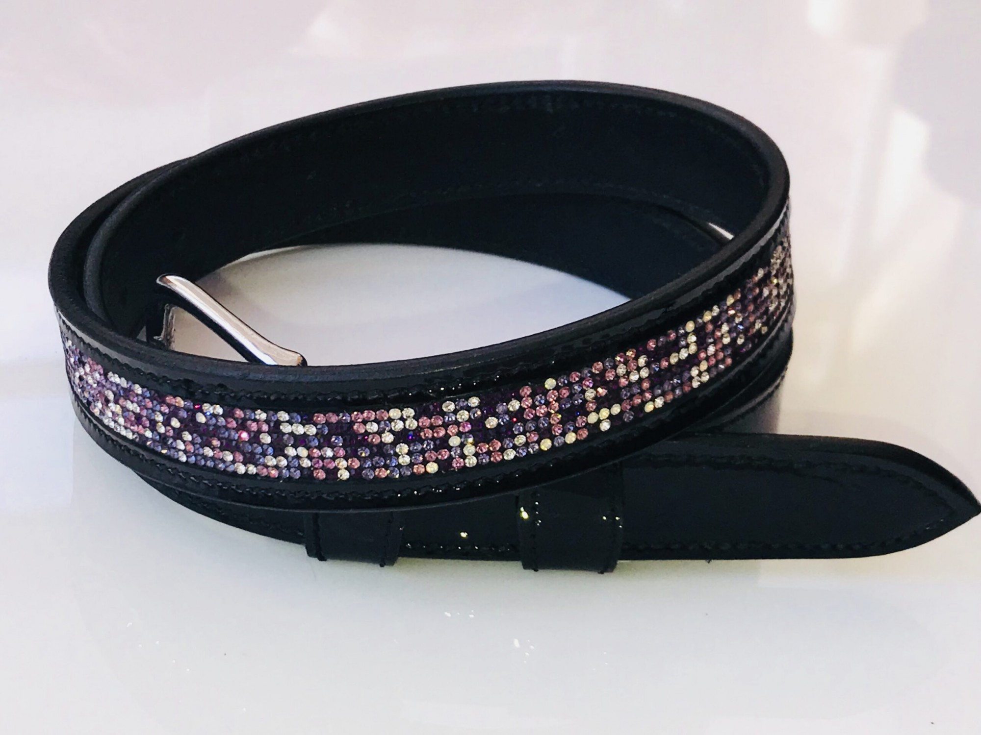The unique black patent leather belt with a mix Crystal design adds that stunning extra sparkle to any outfit…